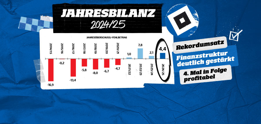 Der HSV setzt seinen positiven wirtschaftlichen Trend konsequent fort. Zum vierten Mal in Folge schließt der Club das Geschäftsjahr mit einem Überschuss. In der Saison 2024/25 erzielte der HSV einen Rekordumsatz in Höhe von 126,5 Millionen Euro – der höchste seiner siebenjährigen Zweitliga-Historie – und erwirtschaftete dabei einen Gewinn von 4,4 Millionen Euro. „Dieses Ergebnis unterstreicht die erfolgreiche Gesamtentwicklung unseres Clubs und stärkt unsere finanzielle Handlungsfähigkeit nachhaltig“, sagt Vorstand Eric Huwer.
