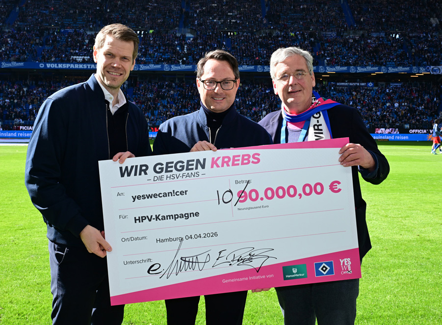 Zum Abschluss der Initiative „Wir gegen Krebs“ des HSV, der HanseMerkur und yeswecan!cer wurden beim Heimspiel gegen Augsburg die Auktionserlöse übergeben.