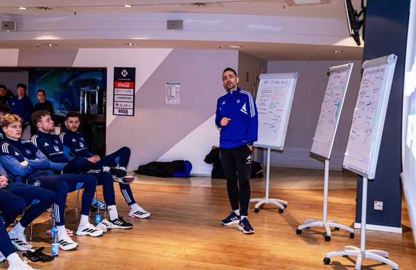 Dieser Trainingsbesuch am Nachmittag war der inoffizielle Auftakt des HSV-Torwarttags 2026, der nach der Einheit in den Räumlichkeiten des Volksparkstadions am späten Nachmittag offiziell eröffnet wurde. Vor den Augen von Cheftrainer Merlin Polzin, Co-Trainer Loic Fave, Christoph Rohmer (Direktor Nachwuchs und Sportstrategie) und Saskia Breuer (Leiterin HSV-Frauen) kamen die 35 Torhüterinnen und Torhüter zusammen, um ein torwartnahes Rahmenprogramm zu durchlaufen. Nach der Eröffnung und ersten Impulsen aus dem Torwartbereich von Profi-Torwarttrainer und Head of Goalkeeping Sven Höh übernahm Tom Mickel, der als langjähriger HSV-Keeper über einen enormen Erfahrungsschatz verfügt, das Wort und sprach über die mentalen Anforderungen eines Torhüters. Bei seinen Ausführungen, die er mit einem Schaubild visualisierte, bezog er sich auf die unterschiedlichen Karriereverläufe der vier Profi-Torhüter der Rothosen.