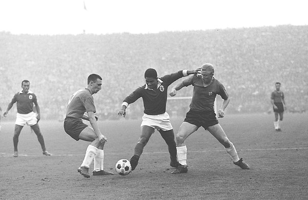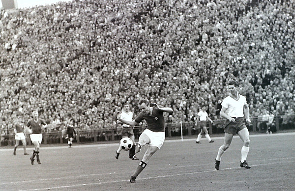 Den Rahmen der Volkspark-Festivals bildeten internationale Teams der Sonderklasse. Zum Auftakt kamen Europas Beste: Benfica Lissabon, amtierender Europapokal-Sieger der Landesmeister, der im Mai seinen Titel gegen Real Madrid eindrucksvoll verteidigt hatte, eröffnete zirkusreif. Die schillernden Ballvirtuosen der Portugiesen allen voran der „schwarze Panther“ Eusébio (Foto: vs. Jochen Meinke und Dieter Seeler) oder „das heilige Monster“ Mário Coluna begeisterten beim 4:3 restlos. Nicht nur die 71.000 Augenzeugen auf den Tribünen, sondern auch die Beobachter auf dem Rasen. HSV-Rechtsverteidiger Gerd Krug gab zu Protokoll: „Ich wäre oftmals am liebsten stehengeblieben, hätte nur zugesehen, wie mühelos sie alles mit dem Ball machten. Manchesmal ist es mir vorgekommen, als würden die Spieler schielen. Mit einem Auge schauten sie auf den Ball, mit dem anderen zu dem mit Sicherheit freistehenden Mann.“