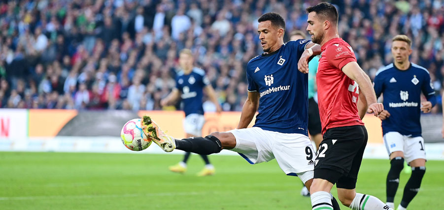 Hamburger SV made history on Friday evening (30 September). In the North derby of the 10th matchday in front of 49,000 spectators in the sold-out Heinz von Heiden Arena, the Rothosen won 2-1 (0-1) at Hannover 96 and set a new record: It was the eighth away win in a row, something that had never happened before in the history of the 2nd division. And this victory came about in dramatic fashion, because the hosts, with the help of HSV, had already taken a 1:0 lead in the 4th minute through Muroya, and the 1:1 equaliser also came about in a curious way when Börner deflected a Heyer cross into his own goal (15th). For the rest of the game, the Reds were unable to force a second goal despite having the advantage and good chances for Glatzel & Co. before Königsdörffer, who had been substituted shortly before, started an unbelievable solo in his own half in injury time, could not be stopped and actually scored the 2-1 winner.