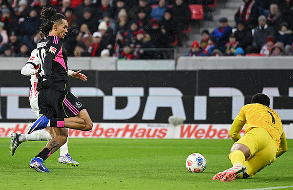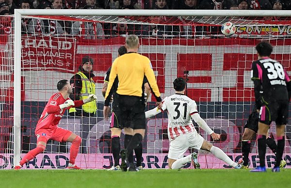 Trotz Unterzahl kämpften die Hamburger leidenschaftlich und kamen in der 82. Minute mit einer erneuten Chance noch einmal gefährlich vor das gegnerische Tor. Kapitän Capaldo eroberte den Ball in der eigenen Hälfte und beförderte ihn in die gegnerische, indem er ihn auf Rössing-Lelesiit durchsteckte. Dieser leitete weiter auf Muheim, dessen Flachschuss jedoch am Freiburger Keeper scheiterte. Im direkten Gegenzug trafen dann die Freiburger zum zweiten Mal ins Schwarze - und das in der Entstehung äußerst umstritten. Nach einem hart geführten Zweikampf zwischen Manzambi und Torunarigha landete der Ball beim eingewechselten Beste, der auf den ebenfalls eingewechselten Matanovic durchsteckte. Der gebürtige Hamburger lenkte den Ball per Direktabnahme unter die Latte und traf zur 2:1-Führung (Foto). Ein äußerst bitterer Rückschlag für die Rothosen, die auch in Unterzahl und Rückstand weiter Druck machten und die Gastgeber sogar forderten. Letztendlich reichten aber ein leidenschatlicher Kampf und auch die elfminütige Nachspielzeit nicht aus, um noch den Ausgleich zu erzielen. Und dieser wäre aufgrund einer großartigen Moral, die der HSV im Breisgau bewies, durchaus verdient gewesen.