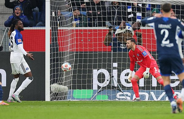 Generell benötigte der HSV Anlaufzeit, um gegen die sehr hoch und griffig verteidigenden Hoffenheimer ins eigene Offensivspiel zu finden. Angefeuert von bis zu 15.000 mitgereisten Fans stand Gocholeishvili auch bei der nächsten nennenswerten Torannäherung im Fokus, als Königsdörffer nach 25 Minuten seine scharfe, aber entscheidend abgefälschte Hereingabe nicht erreichte. Auf der Gegenseite schlug die TSG ein zweites Mal eiskalt zu: Innenverteidiger Kabak schob nach einem feinen Steckpass von Prömel aus kurzer Distanz an Heuer Fernandes vorbei – 2:0. Im unmittelbaren Anschluss wackelten die Hamburger, hatten Glück, dass Traore statt des 3:0 ein Luftloch im Strafraum schlug. Kurz vor dem Pausenpfiff verzeichnete der HSV dann gleich zwei nennenswerte Abschlüsse: Zunächst Königsdörffer und dann Balde scheiterten nach guten Umschaltmomenten an TSG-Schlussmann und Nationalkeeper Baumann. So ging es mit dem 0:2 aus HSV-Sicht in die Kabinen.