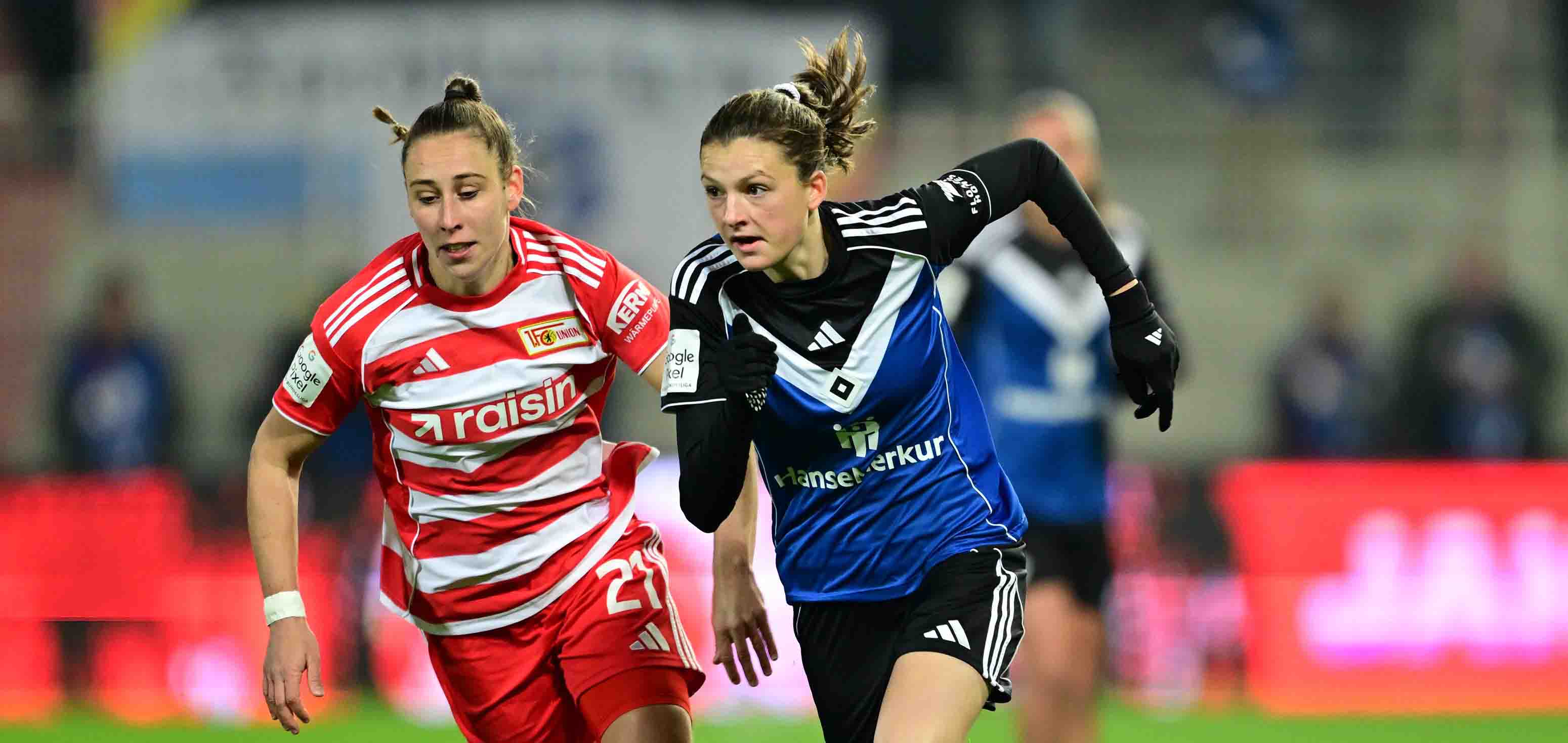 Nur wenige Minuten später dann die beste Chance für die Gastgeberinnen. Nach schnellem Umschaltspiel ging der Abschluss nur hauchzart über die Querlatte. Nach rund einer halben Stunde kamen dann auch die Unionerinnen vermehrt gefährlich vor das Hamburger Tor. Zunächst versuchte sich Lisa Heiseler aus der Distanz, ihren präzisen Abschluss kratzte Haidner gerade noch aus dem Winkel. Nur wenige Augenblicke später war es erneut die Schlussfrau der Rothosen, die das Gegentor verhindern konnte: Nachdem zunächst Victoria Schulz die durchgelaufene Eileen Campbell noch am Abschluss hindern konnte, parierte Haidner den Nachschuss aus der zweiten Reihe stark.