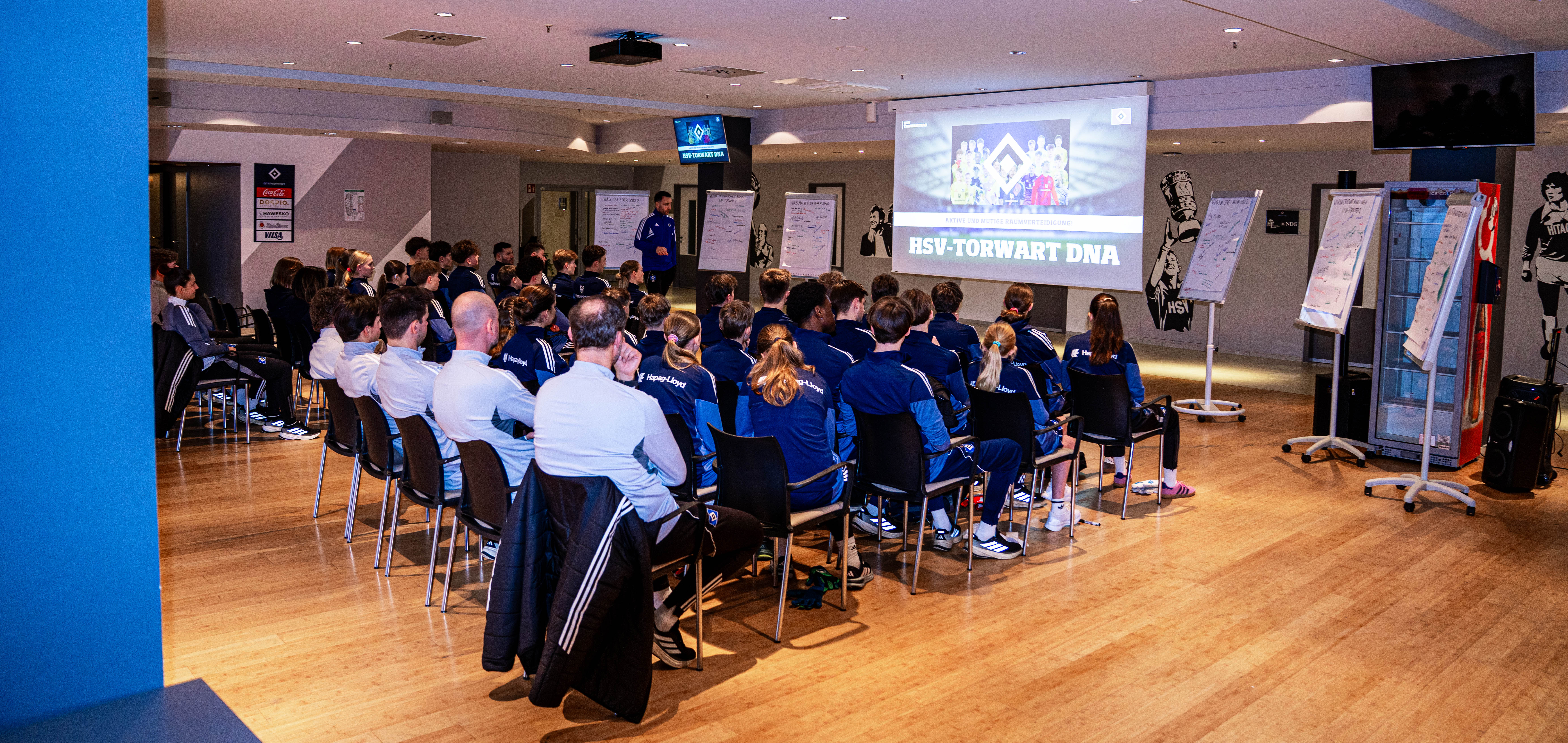 Nach den Vorträgen, bei denen die Torhüterinnen und Torhüter selbst auch mit einbezogen wurden und verschiedene Fragen beantworten mussten, folgten zwei externe Inhalte: Zunächst wurden den Torhüterinnen und Torhütern die Bedeutung der eigenen Augenperformance und Augenaktivierung erläutert sowie Impulse zum Thema Handynutzung vermittelt. Dafür entwickelte das Athleticum am Volkspark bereits zuvor in enger Zusammenarbeit mit der Torwartabteilung des HSV Schwerpunkte in dem Bereich der Augenperformance im Leistungsfußball. Das Wissen und die Trainingsmethoden, von welchen bislang ausschließlich die Profi-Torhüter profitierten, konnten anschließend an zehn Stationen eines „Vision Circle“ zum Augentraining direkt selbst in die Praxis umgesetzt werden – alles unter der Anleitung der Abteilung Optometrie aus dem Athleticum am Volkspark. Zum Abschluss wurde es noch mal richtig aktiv: Nach einem Motivationsvortrag zu mentalen und körperlichen Anforderungen auf dem Weg zum Erfolg bat der ehemalige Weltmeister (2015) im Thaiboxen, Human Nikmaslak, aus dem ToughGym Hamburg alle Torhüterinnen und Torhütern zu einer knackigen Session mit Inhalten aus dem Boxtraining. Dabei ging es vor allem um Zielstrebig mit schnellen Füßen, Widerstandsfähigkeit und Durchsetzungsvermögen.