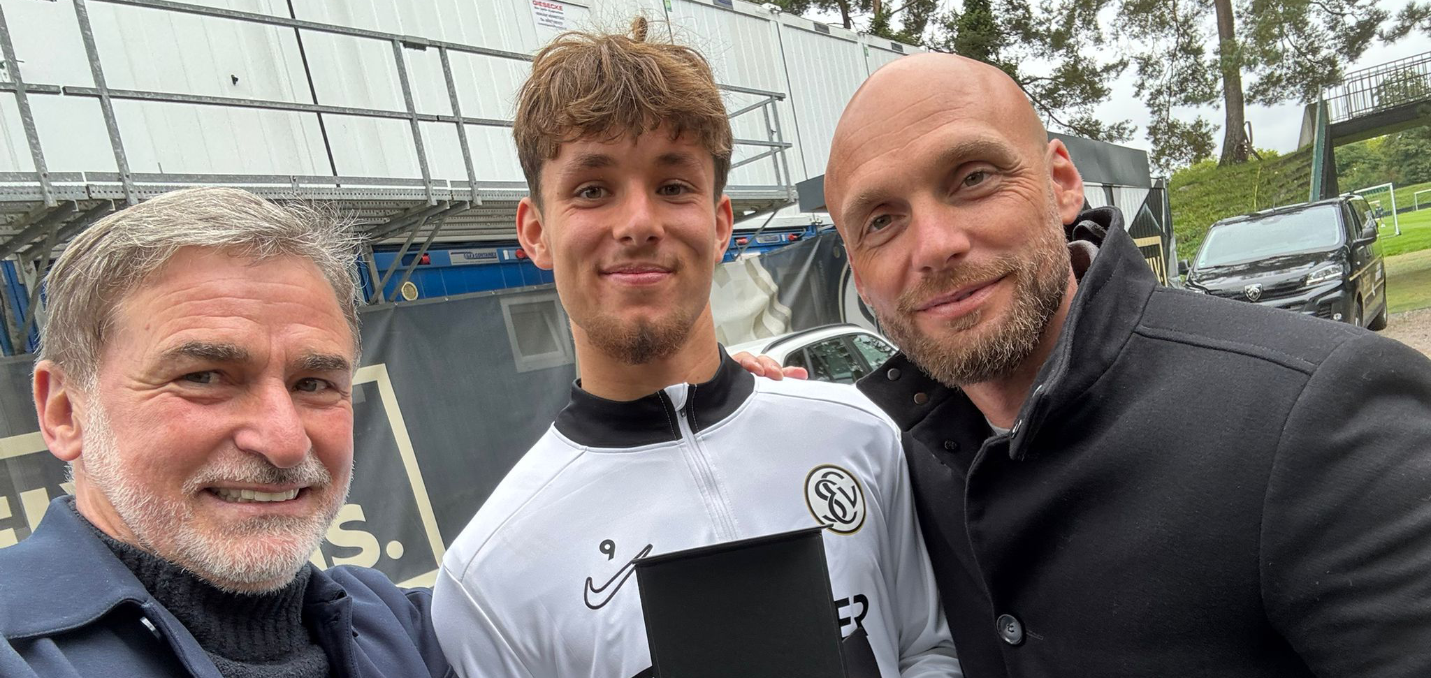 Besuchte Vorstand Stefan Kuntz am Freitag die verliehenen Otto Stange und Lukasz Poreba bei der SV Elversberg und überreichte ihnen ein Stück Aufstiegsrasen, traf Youngster Stange einen Tag später zum 1:0-Siegtreffer für seinen neuen Club.