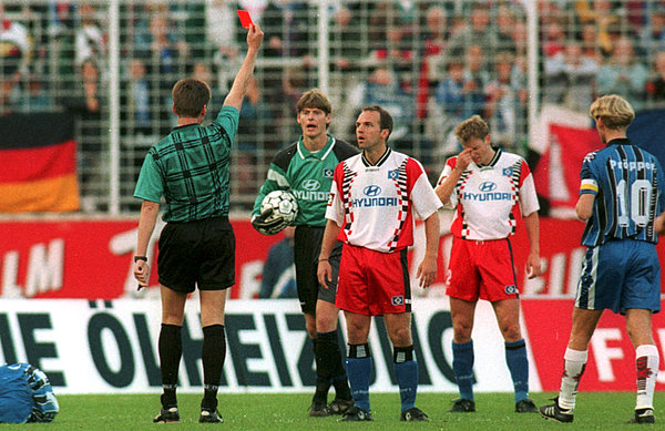Ziemlich buntes Treiben: In HSV-Bundesliga-Auftritt #1124, dem Stadtderby gegen St. Pauli am 15. September 1996 (3:0), nestelte der Unparteiische insgesamt sagenhafte zwölfmal an Brust- und Gesäßtasche: 9x Gelb, 1x Gelb-Rot (= 2 Zugriffe), 1x glatt Rot (Foto). Am häufigsten Gelb in einer Partie mit HSV-Beteiligung (11x) sahen Spieler und Zuschauer am 15. Februar 2014 an der Hamburger Straße in Braunschweig (2:4). Und die meisten Platzverweise, nämlich satte vier (2x Gelb-Rot, 2x Rot), gab es in Spiel #1517 am 22. März 2008 beim VfL Wolfsburg (1:1 A). Dazu die ewige Skatfrage: Wer gibt? Die Antworten aus dem Paradies der Erinnerung; Ehre, wem Ehre gebührt: Hartmut Strampe (Foto), Knut Kircher und Thorsten Kinhöfer.