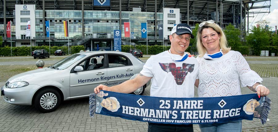 Das letzte Auto von Hermann Rieger bekam am Sonnabend (9. Mai) einen neuen Besitzer. Ines und Malte Nemitz hatten das Gefährt, einen silbernen Chevrolet Lacetti, des 2014 viel zu früh verstorbenen HSV-Kultmasseurs in der letzten Woche für 5.678 € für den guten Zweck ersteigert. Doch nicht nur das: Das Ehepaar aus Bad Oldesloe erhöhte diesen Betrag noch einmal und überwies am Ende stolze 7.881 € an den Fanclub „Hermann's treue Riege“, der das Auto zur Verfügung gestellt hatte, um die Einnahmen seinerseits in voller Höhe für die HSV-Hilfsaktion #HSVerfür Hamburg zu spenden.