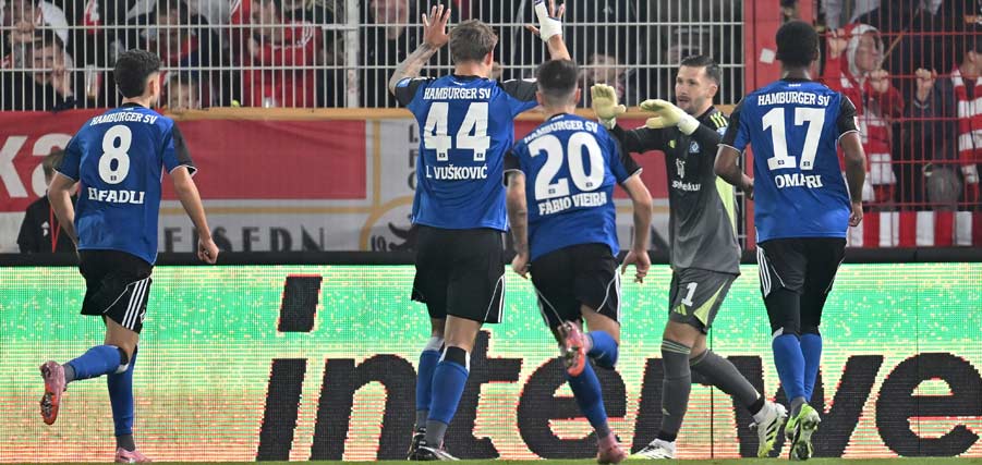 Eine gute Leistung und ein guter Schnitt für die Defensivabteilung der Rothosen, die auch an der Alten Försterei einen sauberen Job machte – und einer von ihnen ganz besonders: Daniel Heuer Fernandes parierte in der Anfangsphase sogar einen Elfmeter (Foto), fungierte darüber hinaus als sicherer Ruhepol und wurde zum zweiten Mal in Folge als Keeper in die Elf des Tages im Fachmagazin kicker gewählt. Und: Ebenfalls zum zweiten Mal nacheinander votierten auch die Fans des HSV für ihren Torhüter bei der Wahl zum Man of the Match. Auf den Plätzen zwei und drei landeten mit Nicolai Remberg und Luka Vuskovic ebenfalls zwei Akteure aus der eher defensiv agierenden Abteilung – ein Beleg dafür, dass das 0:0 in Berlin eine weitere sehr gute und kompakte Defensivleistung darstellte und die erneute weiße Weste alles andere als Zufall war.